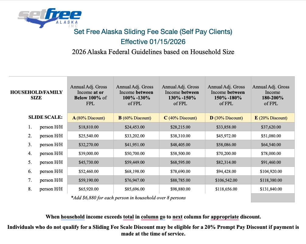 • I acknowledge that the above and attached information is an accurate reflection of my household income. I understand that I am responsible for updating Set Free Alaska (SFA) of changes in income within 30 days. In addition, I understand that I am responsible for payment of services rendered at SFA, with or without a discounted rate.
